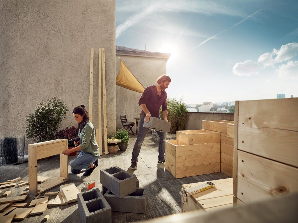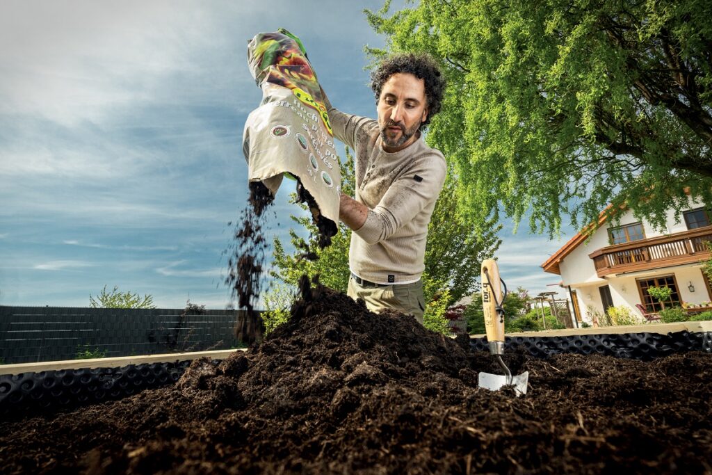 Naplnit vyvýšený záhon jen zeminou nestačí, jinak se ztrácí skutečná výhoda – tlení. Teplota půdy a celková výhřevnost ve vyvýšeném záhonu zajišťuje dobré podmínky pro růst. Tento záhon funguje také jako kompostér, který recykluje zahradní odpad, zbytky rostlin, posekanou trávu a organický odpad, což vede k bohaté úrodě. „Vyvýšený záhon pro okrasné rostliny se vrství jinak než vyvýšený záhon pro ovoce a zeleninu,“ upozorňuje David Benda, odborník z oddělení zahrady v projektových marketech Hornbach. Optimální podmínky pro ovoce a zeleninu vytvoříte vrstvením materiálů. Ve spodní části záhonu použijte hrubý materiál, jako jsou větve a směrem nahoru vrstvy postupně zjemňujte. Pokud máte dřevěný vyvýšený záhon je dobré stěny záhonu pokrýt jezírkovou fólií nebo bublinkovou fólií. Jako základ pro záhon položte vrstvu tenkých větví, která umožní odtok vody a cirkulaci vzduchu. Tato vrstva se časem zhroutí, proto ji dobře zhutněte. Vrstvu chrastí pokryjte posekanou trávou nebo obrácenými drny, které pomáhají rostlinám růst. Střední vrstvu vyplňte polorozloženými rostlinnými zbytky, zahradním odpadem a posekanou trávou, například listím a odřezky z keřů. Aplikujte přírodní biostimulant tvořený bakteriemi a houbou Trichoderma, která podporuje růst a bohatou úrodu rostlin. Nakonec použijte půdu pro vyvýšené záhony nebo výsevní půdu, pokud chcete vysazovat mladé rostliny zeleniny nebo bylinky.