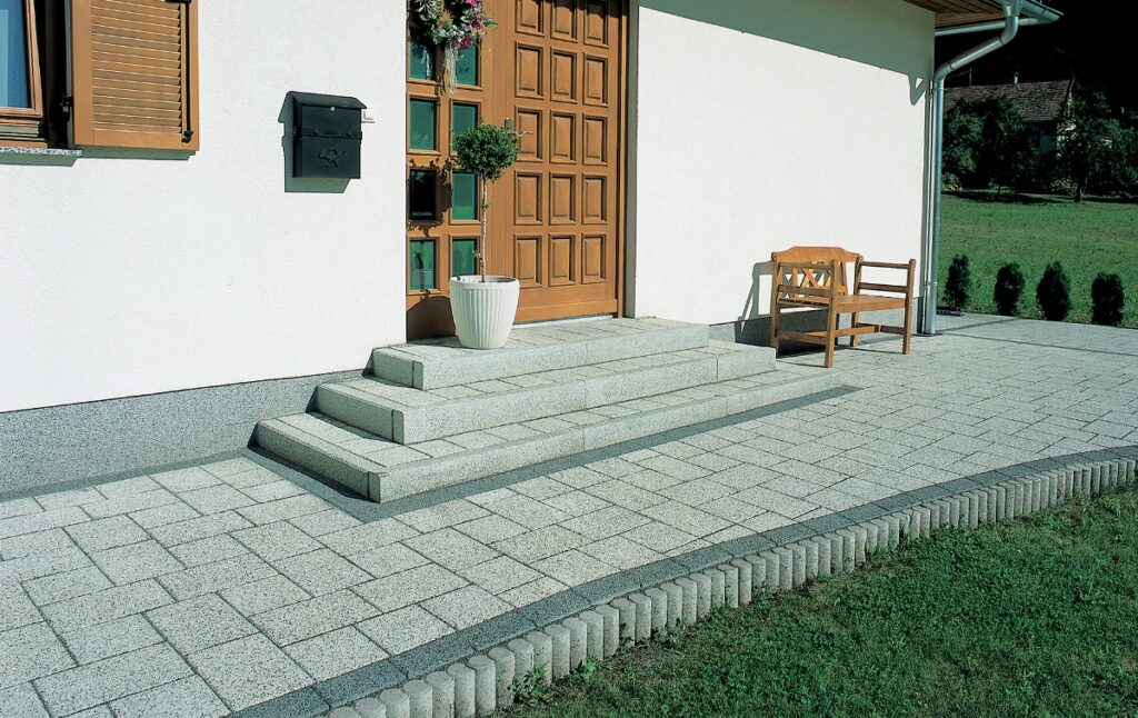 Moderní řešení kombinující různé velikosti dlažby. Vhodné pro chodníky i plochy s občasným provozem automobilů. Barevné varianty, jako je černá, šedá, červená nebo oranžová, skvěle doplňují současnou architekturu.