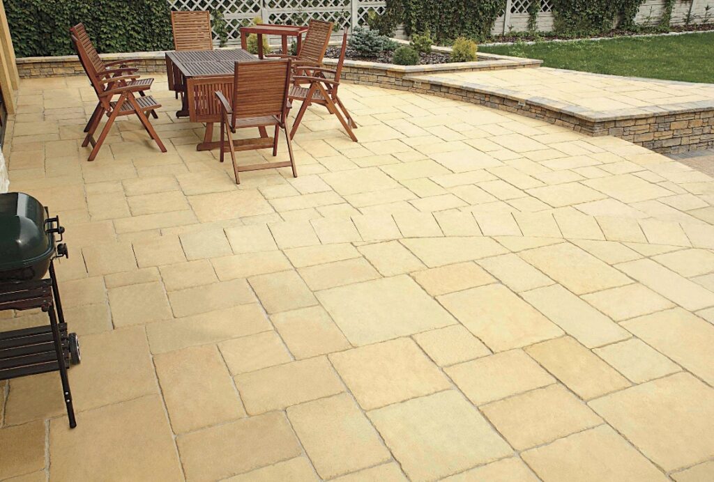 Betonová dlažba imitující pískovec dodává příjemnou atmosféru a přírodní vzhled. Vyznačuje se teplými barvami a nepravidelnými hranami, které dodávají prostoru jedinečný vizuální efekt.