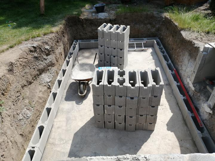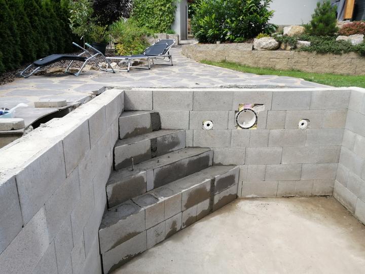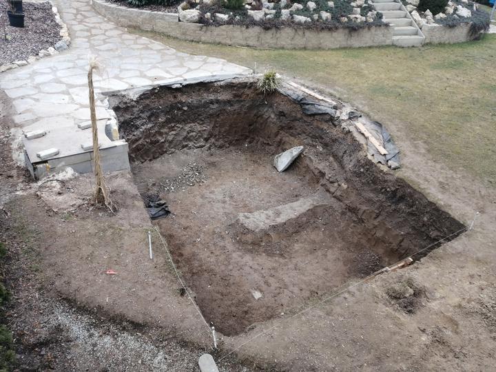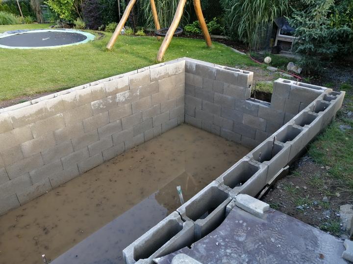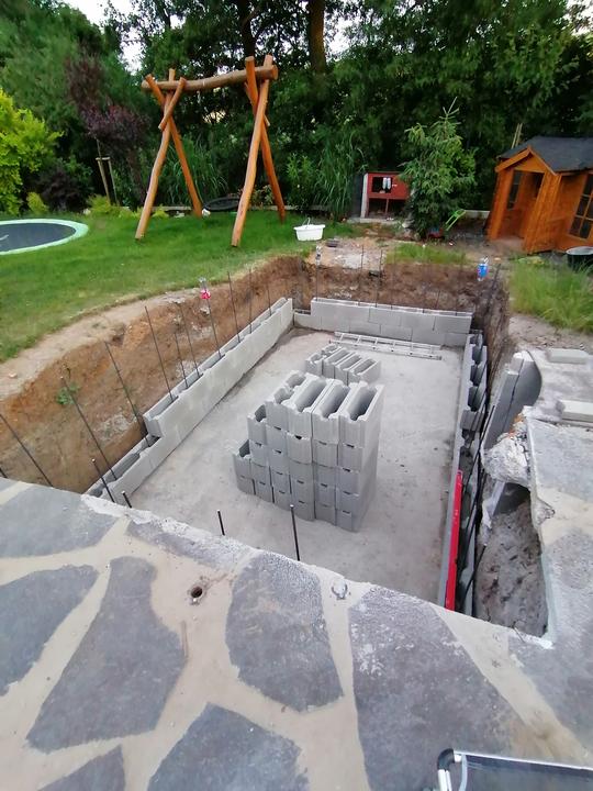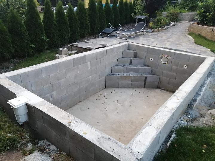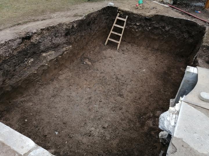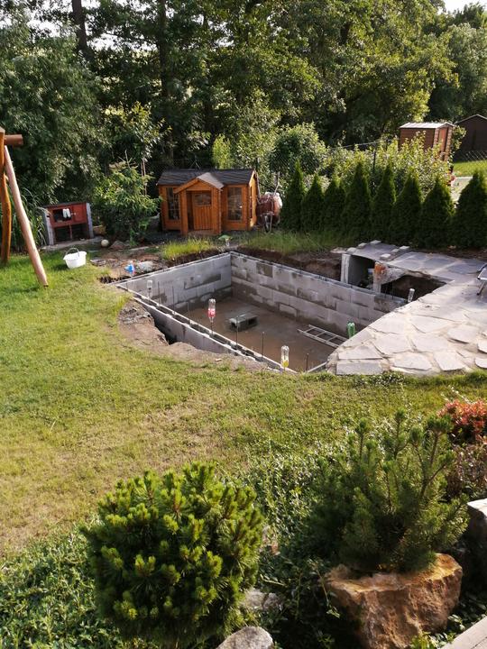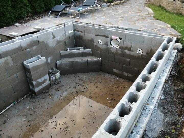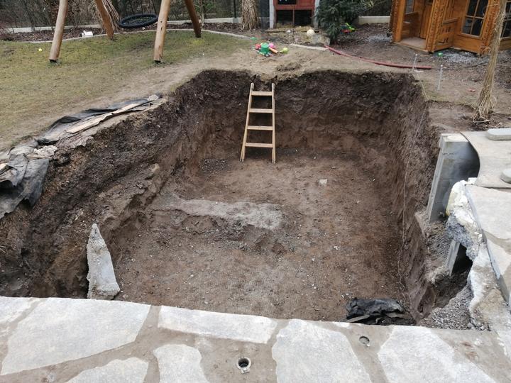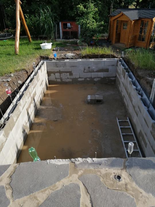 Vše vykopáno a odvoženo ručně v jednom člověku. Původně byl kulatý bazén z Moutfieldu. K tomu byly doloženy kameny. Ty sem vyřízl na požadovaný tvar. Na kámen a bednění přijde nalepit betonový lem. Ztracené bednění 20cm šíře. Vnitřní rozměry 4,8x2,8…