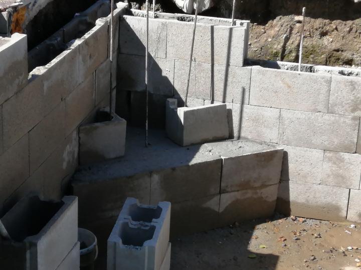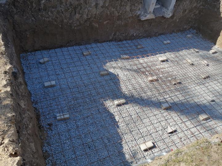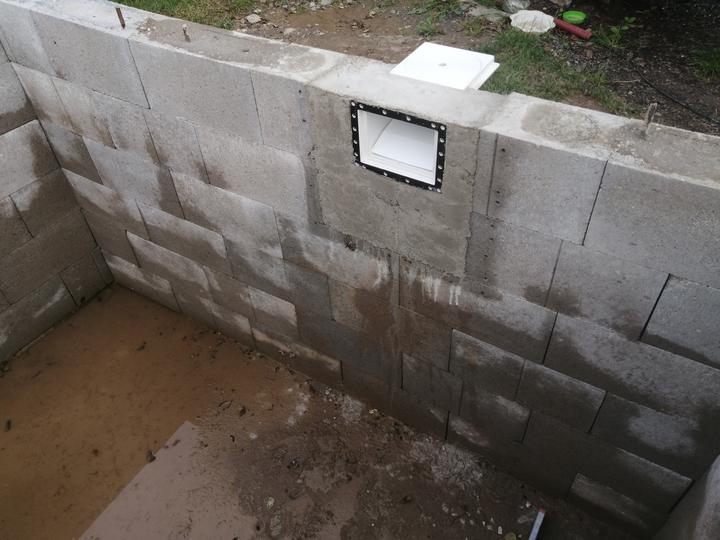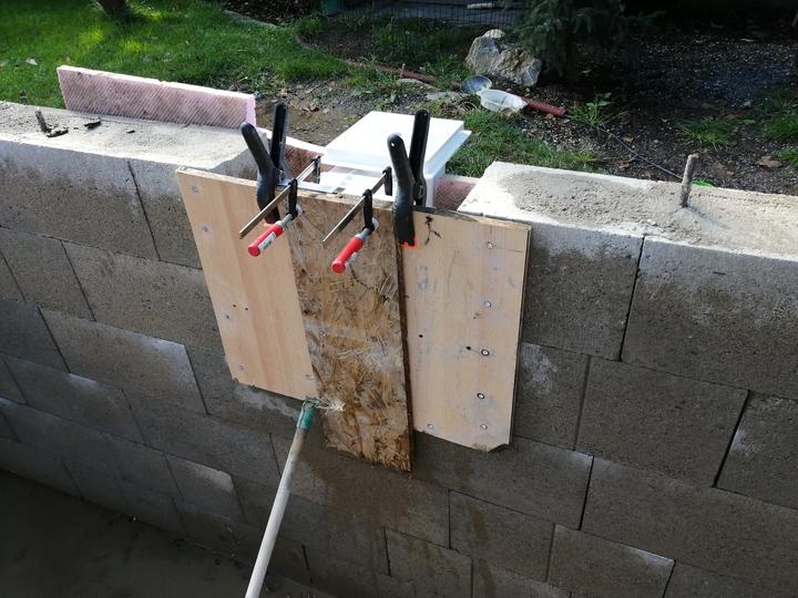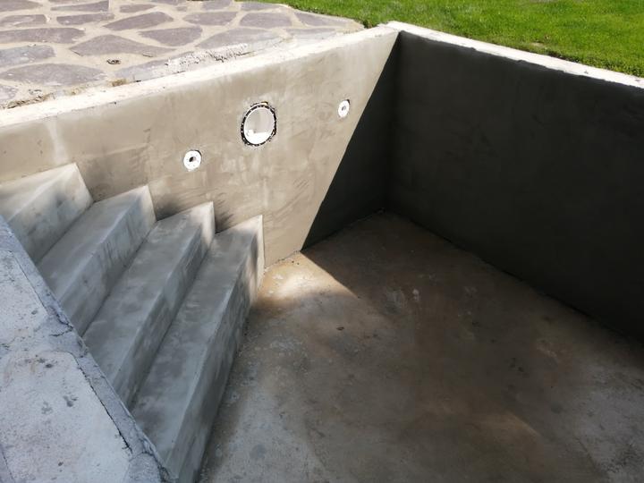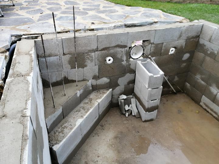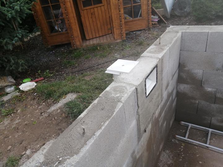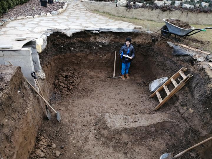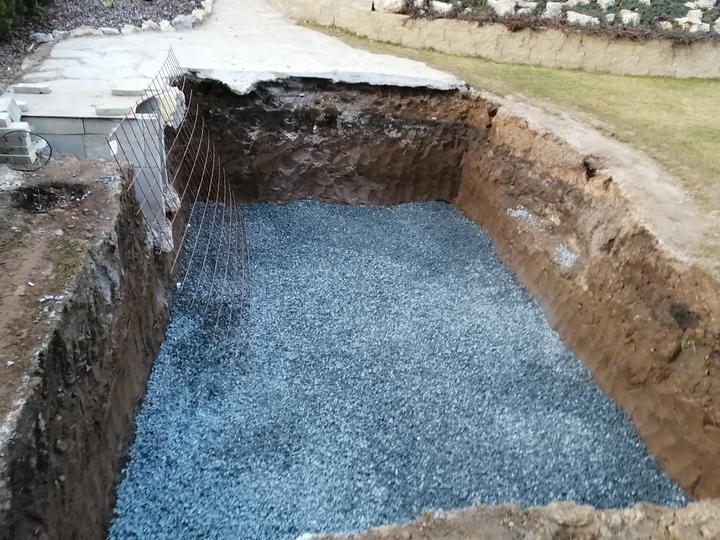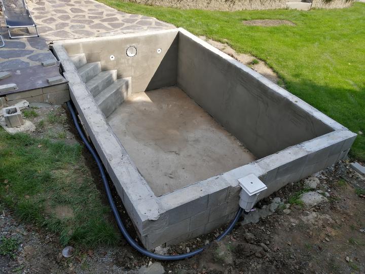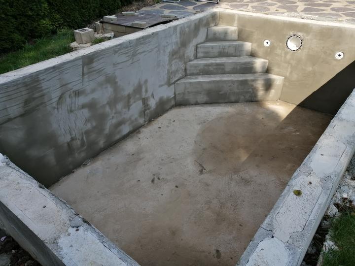 Vše vykopáno a odvoženo ručně v jednom člověku. Původně byl kulatý bazén z Moutfieldu. K tomu byly doloženy kameny. Ty sem vyřízl na požadovaný tvar. Na kámen a bednění přijde nalepit betonový lem. Ztracené bednění 20cm šíře. Vnitřní rozměry 4,8x2,8…