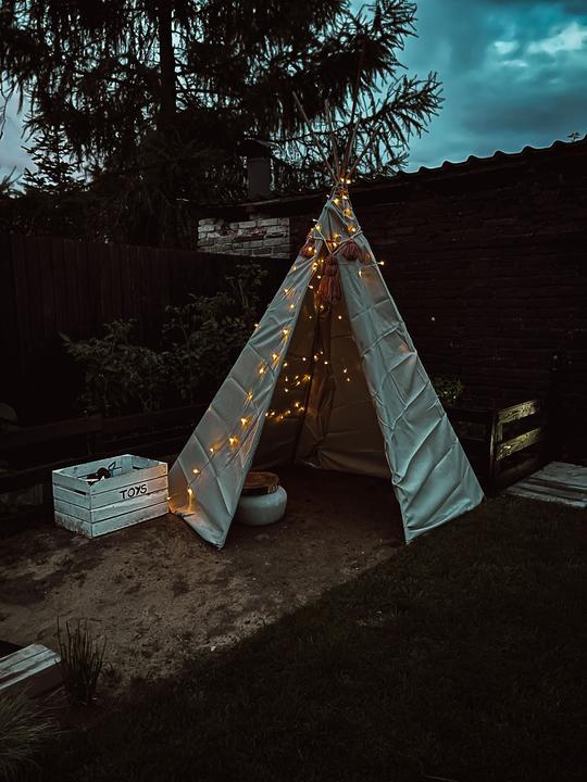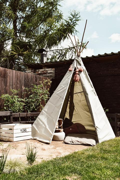 DIY teepee na zahradu pro děti, úpravy nás ještě čekají a tak jsem nechtěla dělat nic stálého, plachty na zastínění a bambusové tyčky, romantika se světýlkama