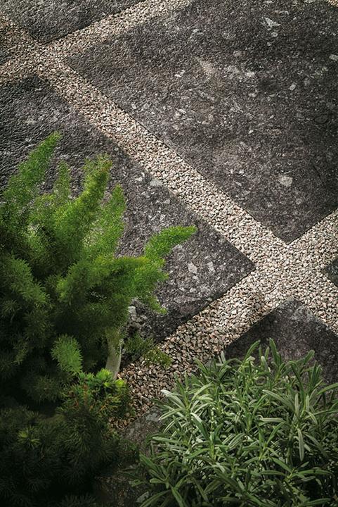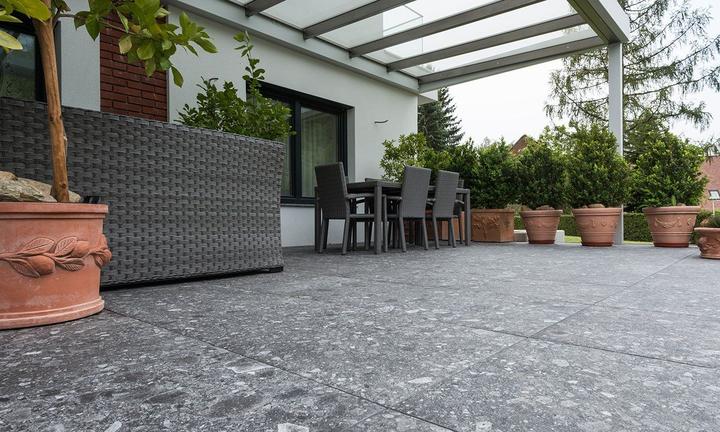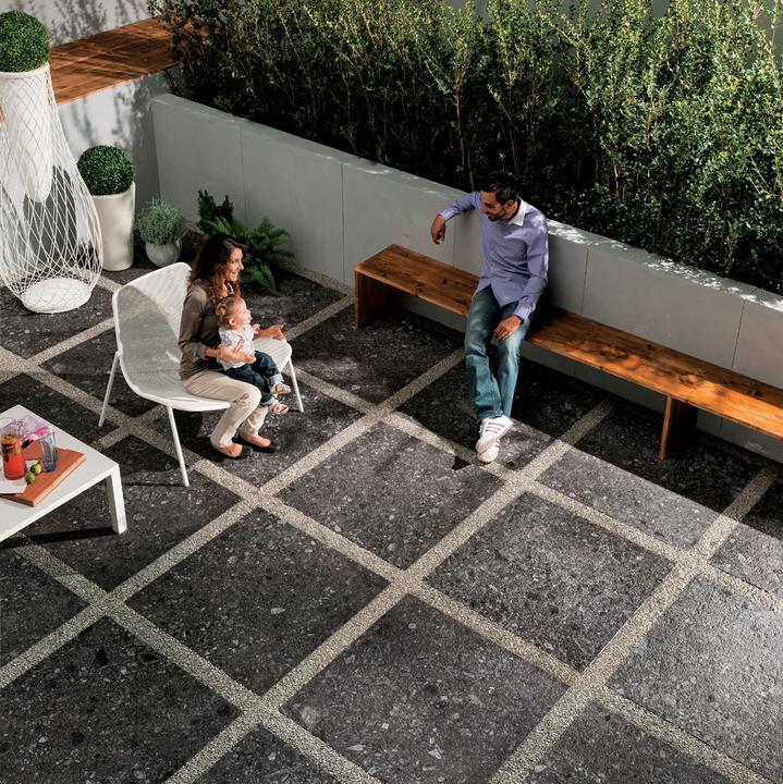 Norr Svart slinutá venkovní dlažba velkoformátová 60x60 tloušťka 2 cm, která se pokládá bez lepení na terče, trávu nebo štěrk.