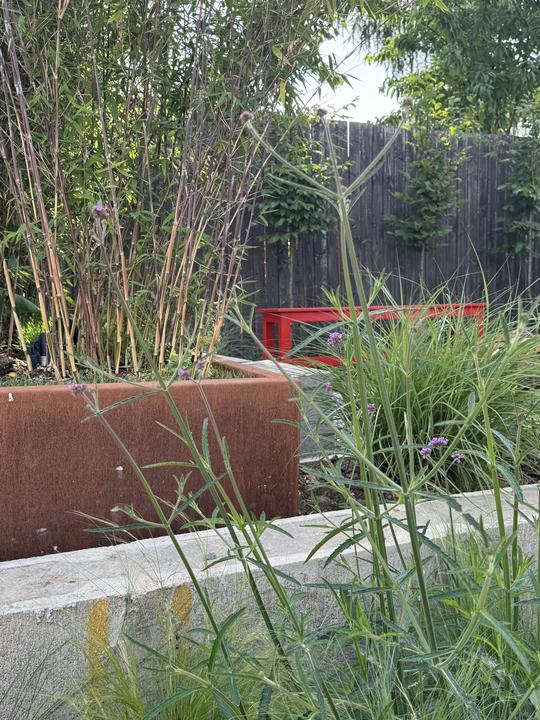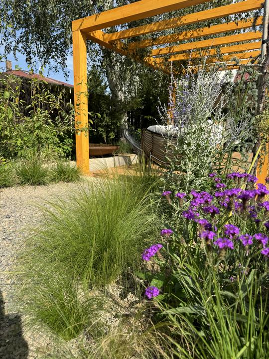 Květinová zahrada s červenou lavičkou
