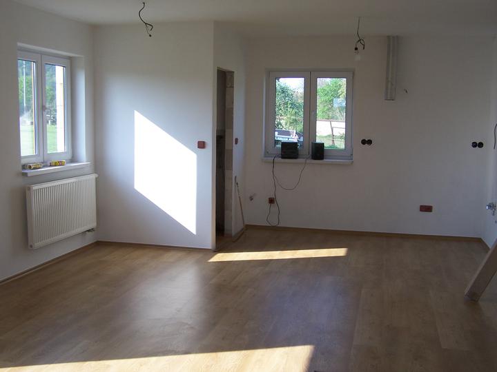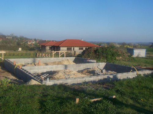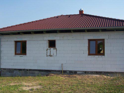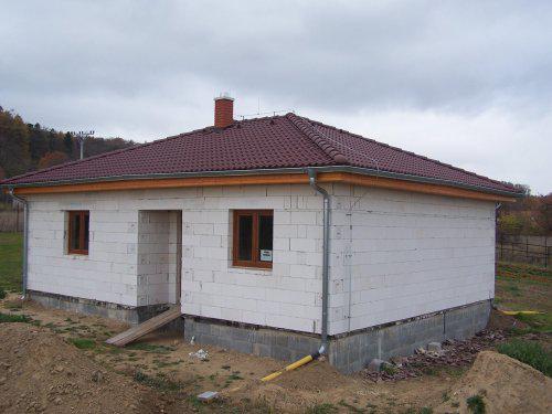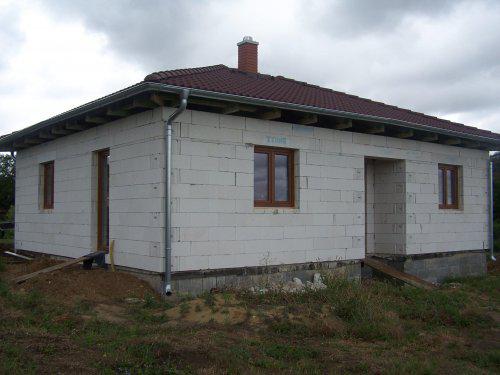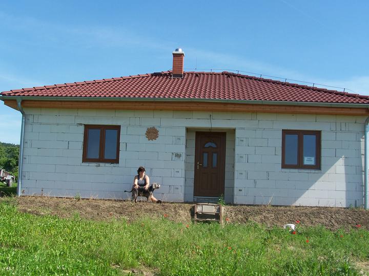 Protože jsme s manželem vychovali 3 děti a nyní jsou dospělé, ale hlavně proto, že v baráku je nás moc a také osoby, které mě prudí, rozhodli jsme se, že i přes náš věk do toho půjdeme. Koupili jsme už v roce 2000 parcelu velmi levně, protože tam nebyly sítě. Původně jsme uvažovali jen o zahradě. Rok se s rokem sešel a v roce 2006jsme s velmi špatnou mělnickou firmou začali stavět. S nimi jsme se na podzim ve zlém rozešli a stáli jsme 1/2 roku. Pak jsme dostali tip na malou zednickou firmu z okolí a dodnes jsme s nimi neskutečně spokojeni. Protože máme kde bydlet a zase nás nic moc netlačí, řekli jsme si, že budeme stavět pomalu. Takže rok 2007 hrubá stavba, střecha a okna. Další rok pouze elektrika a příprava na vodu, odpady. Letos jsme se opět finančně trochu nadýchli a firma dodělala podlahy, stropy, omítky vnitřní. Pokračovali jsme známým, který udělal za velmi slušnou cenu topení. Bohužel teď jsem musela reklamovat drahé vstupní dveře, tak dělají novou výplň.Zatím probíhá reklamace bez problémů. Muž dělal okolo domu zemní práce a protože k tomu máme velký pozemek, já mám neustále práci na zahradě ( tráva, kytky, keře ). Milujeme zahradu, takže si chceme vybudovat " na stará kolena" svůj malý ráj na Zemi. Bydlet tu budeme jen my dva a pes.