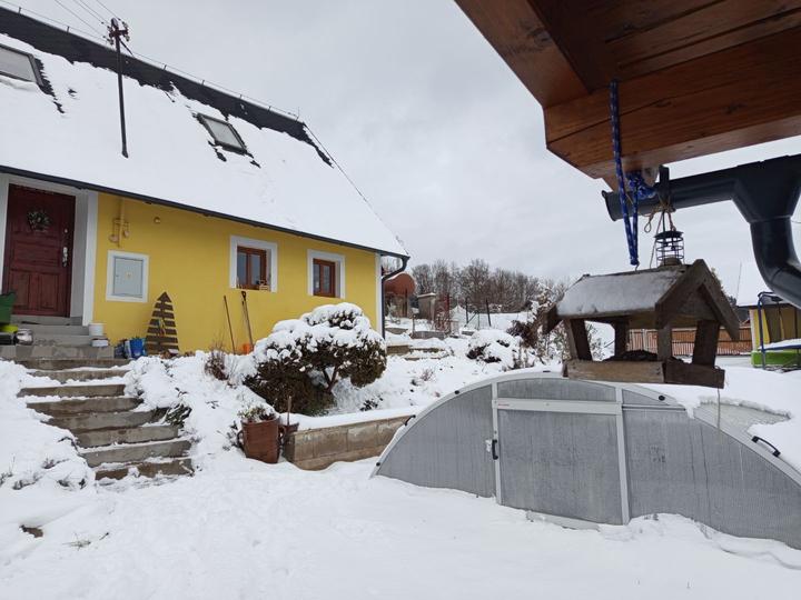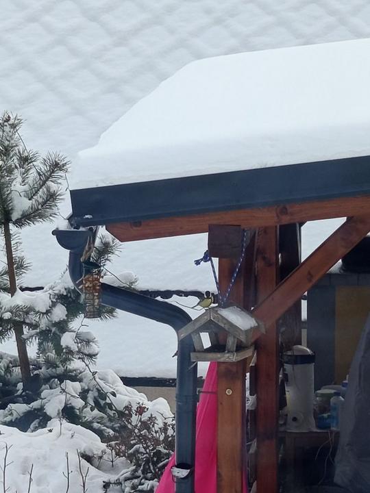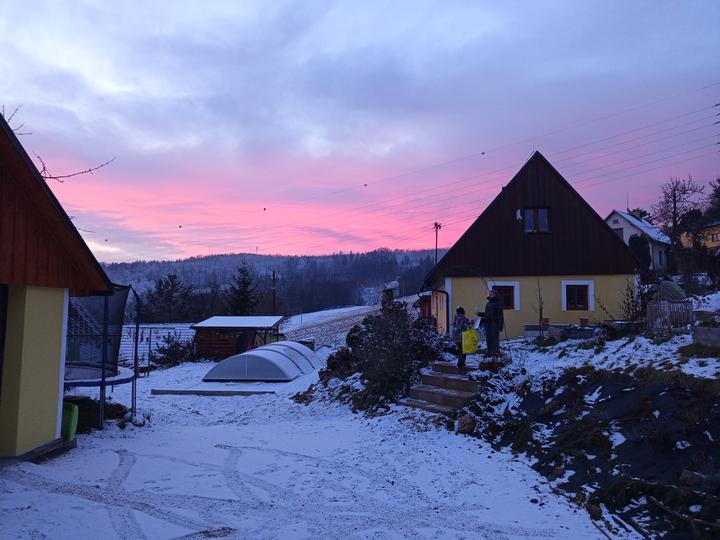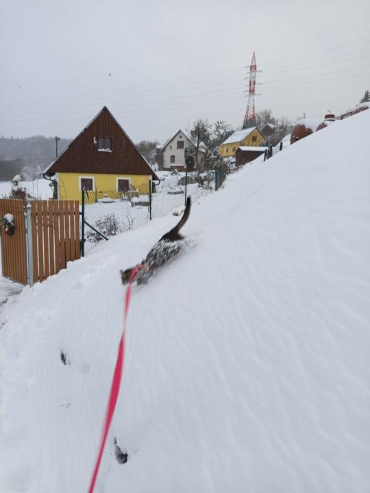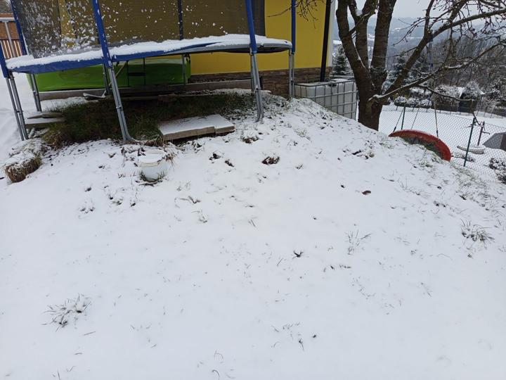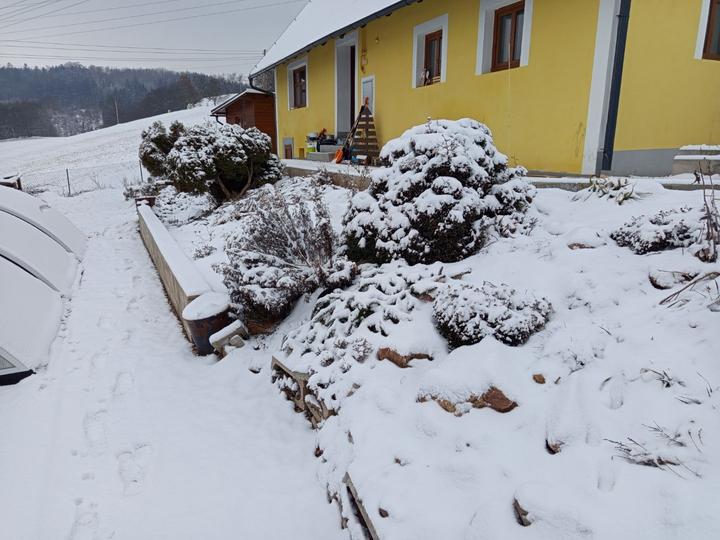 24.11.2025 dnes ráno nás překvapila první sněhová peřina, drží celý den, takže jsme vytáhli hráblo.