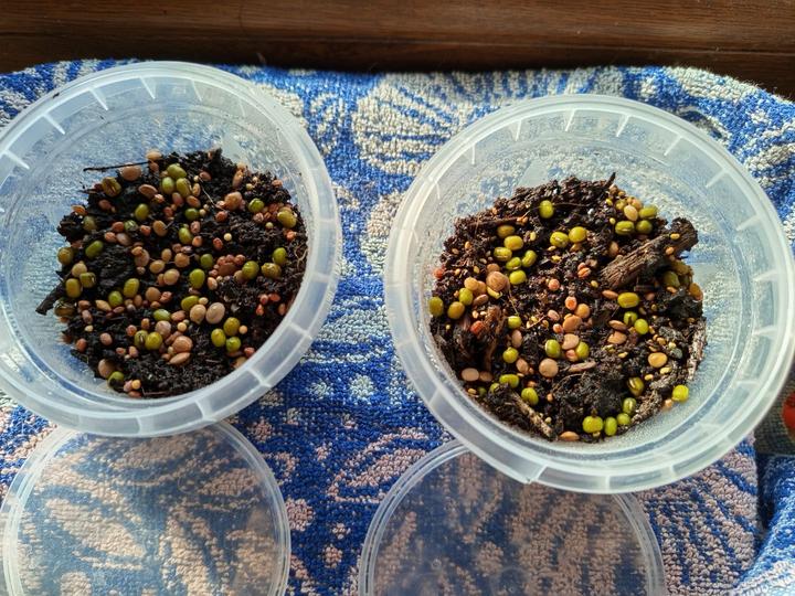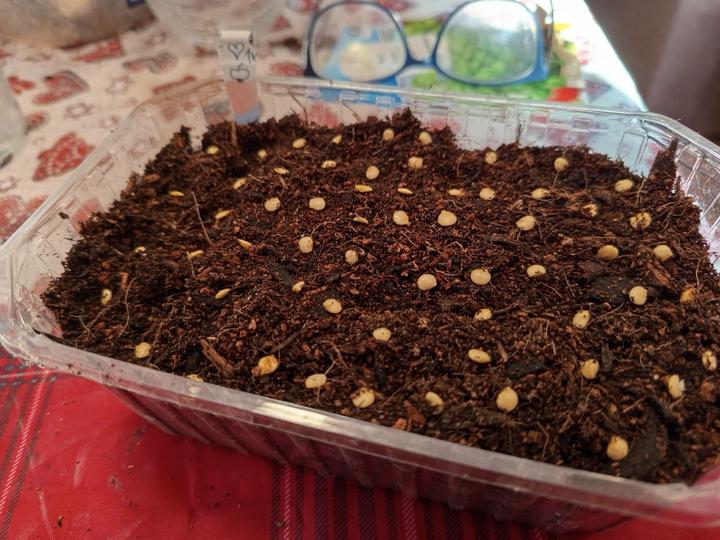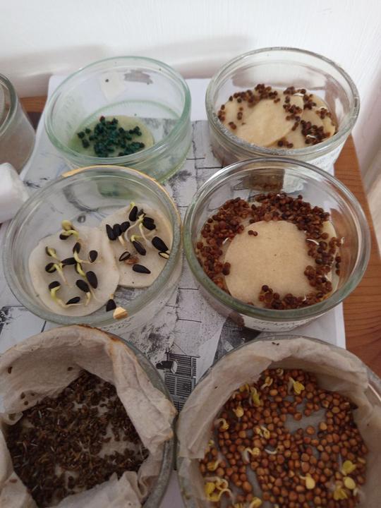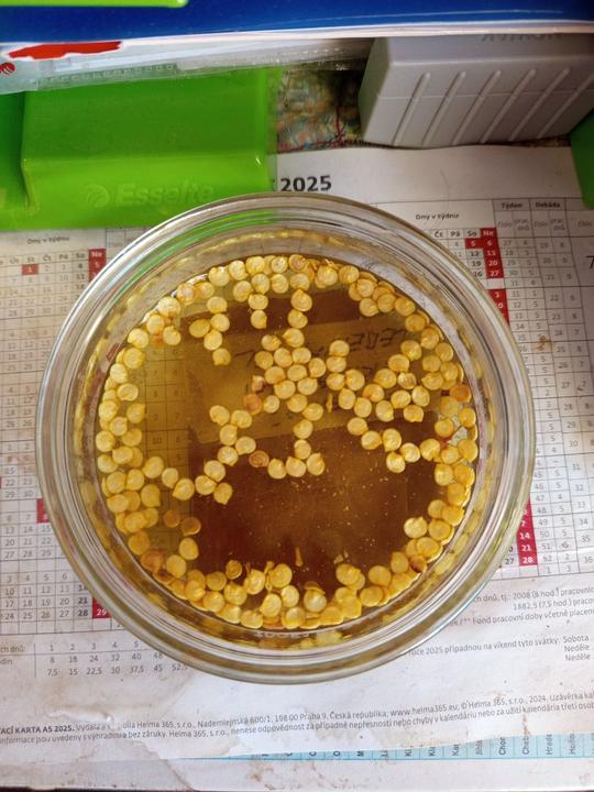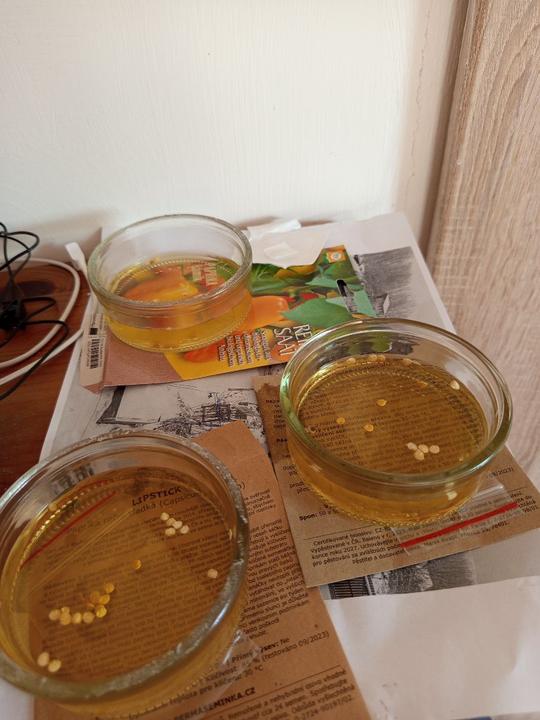 5.2.2025 semínka papriky prozatím umístěna na na mokrý ubrousek, manžel totiž nedovalil substrát. Naložena ještě semínka z vlastní produkce papriky Lebenapfel ty potvory furt plavaly, musí se jim trošku pomocí zamícháním).