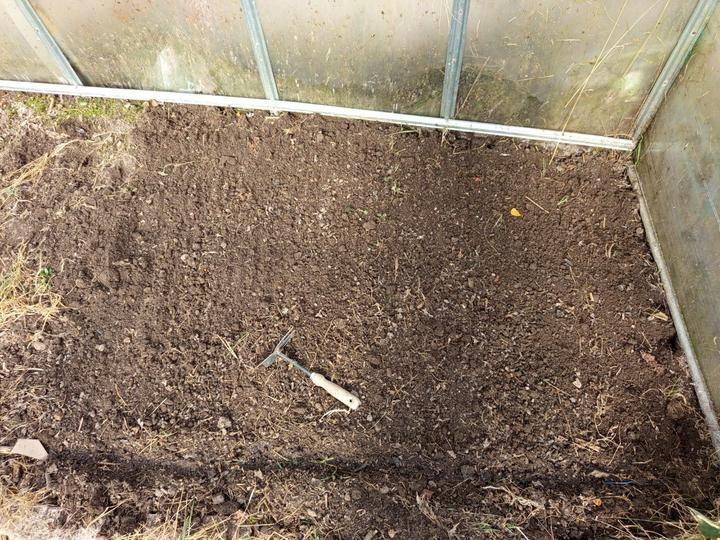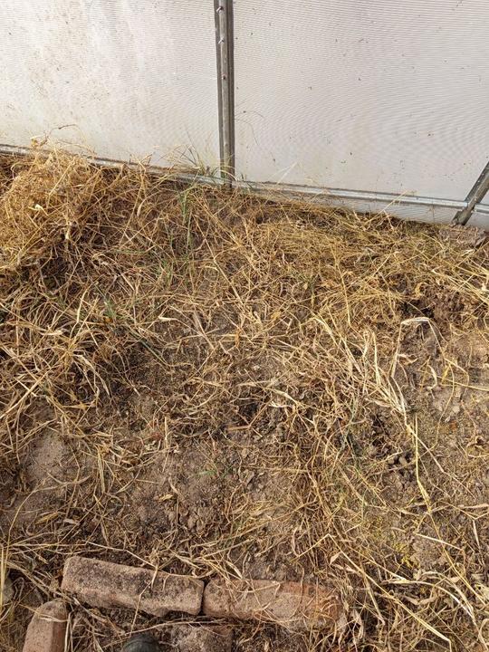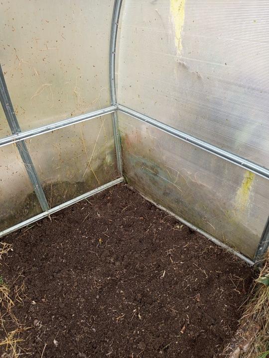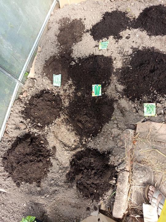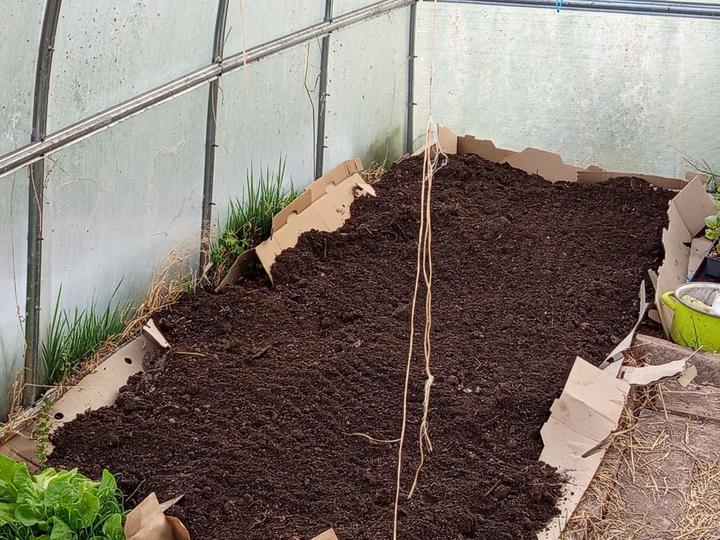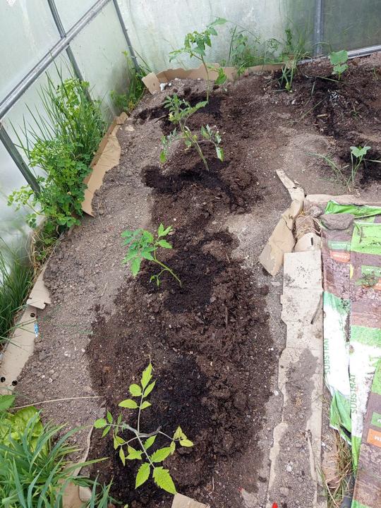 1.6.2025 zasazena 4 rajčat do skleníku (0d zdi Start, Tornádo, Sonet, San Marzano), zasaženy brambory a posypané čerstvou trávou od Radima.