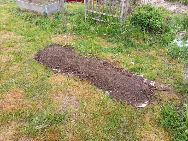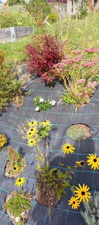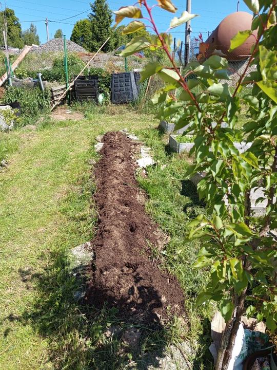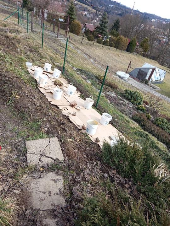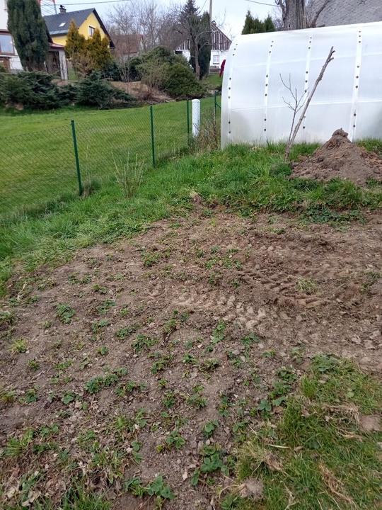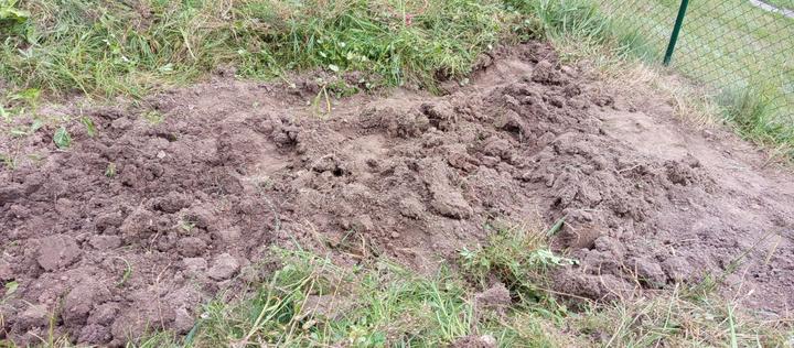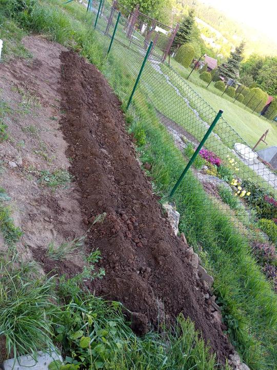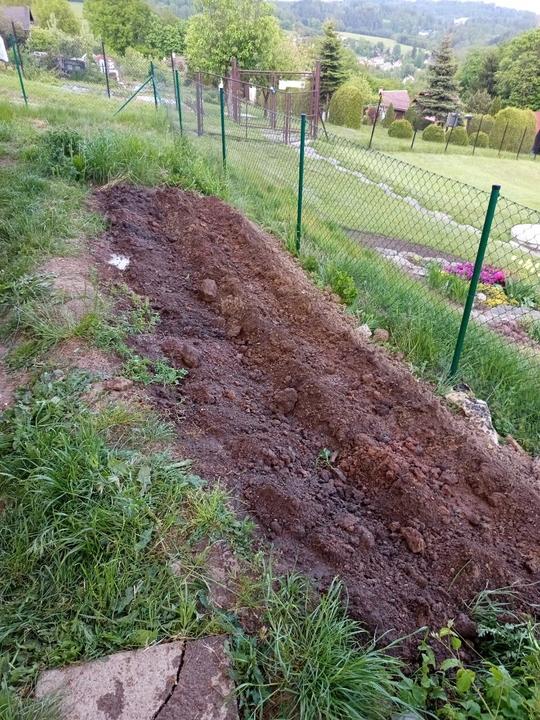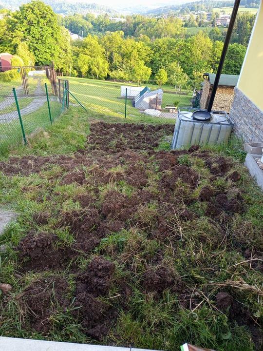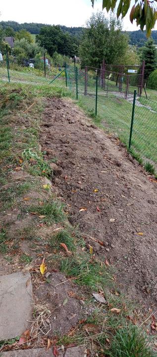 19.8.2025 záhon podél domu odplevelen a vyhloubeny jamky pro jamky pro jahody (25 ks). Zakartonován záhon pod trampolínou. Příjdou tam také jahody.