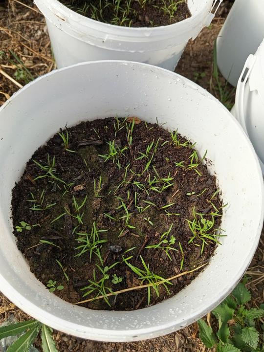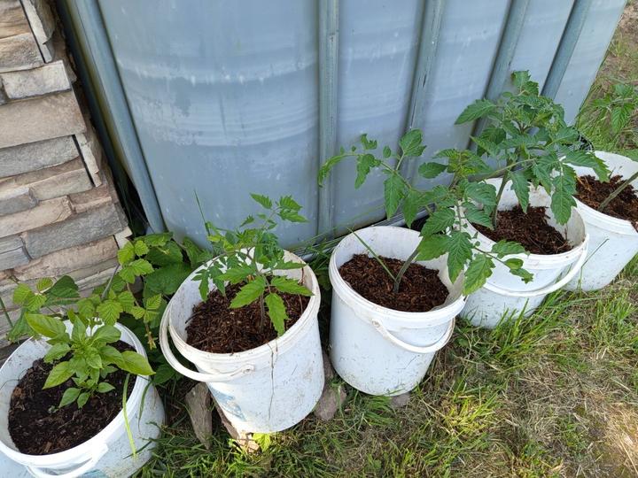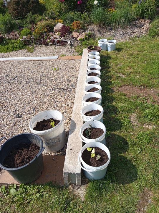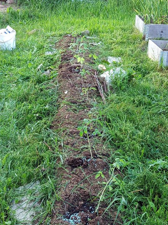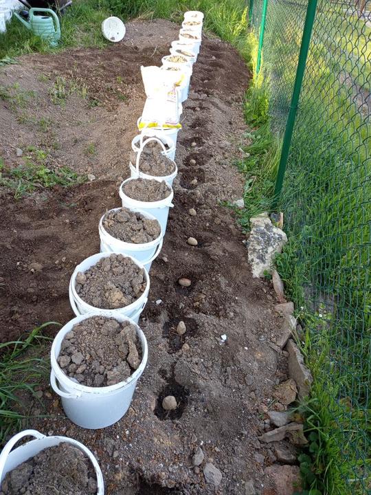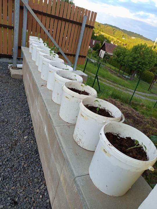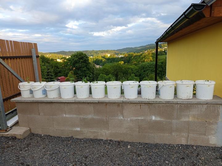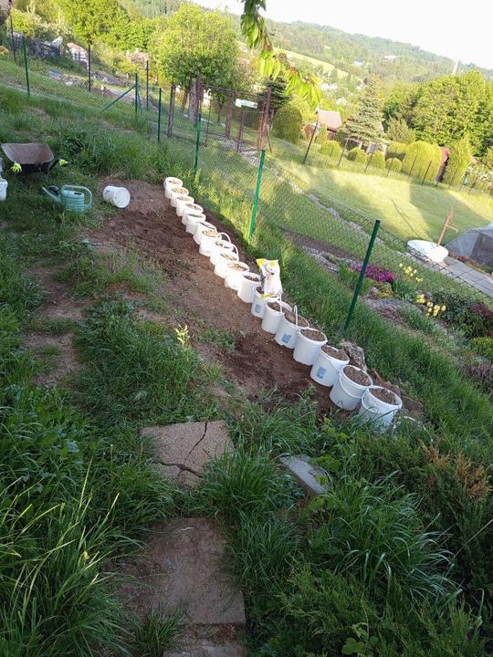 12.6.2025 nasypat přípravek ke zvýšení alkality. Do kyblíku navrtaný dírky,zasazeny namnožené sazenice batátů. Dokončení přihnojování CA+Mg. Zasazena 4 keříčková rajčata od Lídy, pokus se zbylým porkem- zasažen do kyblíku. Kyblikova rajčata zamulcovan nacucanou štěpkou. Do hlíny vsazena naklicena semínka dýně. Zasazena poslední rajčata.sekani strunovkou.