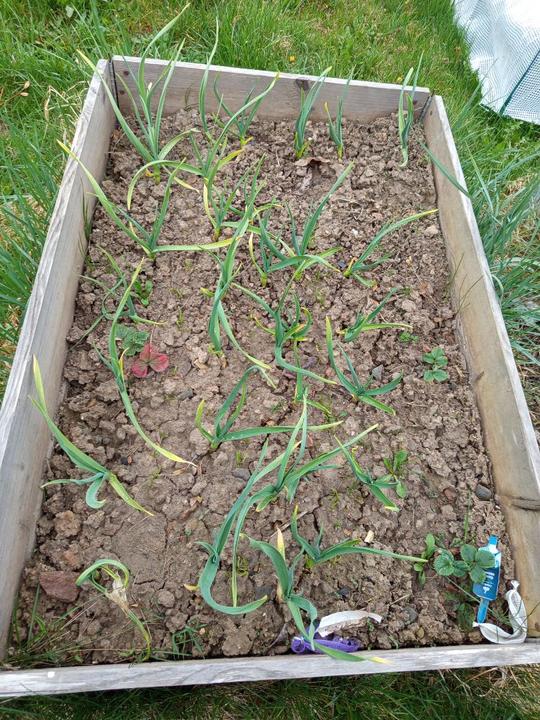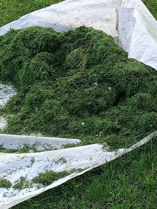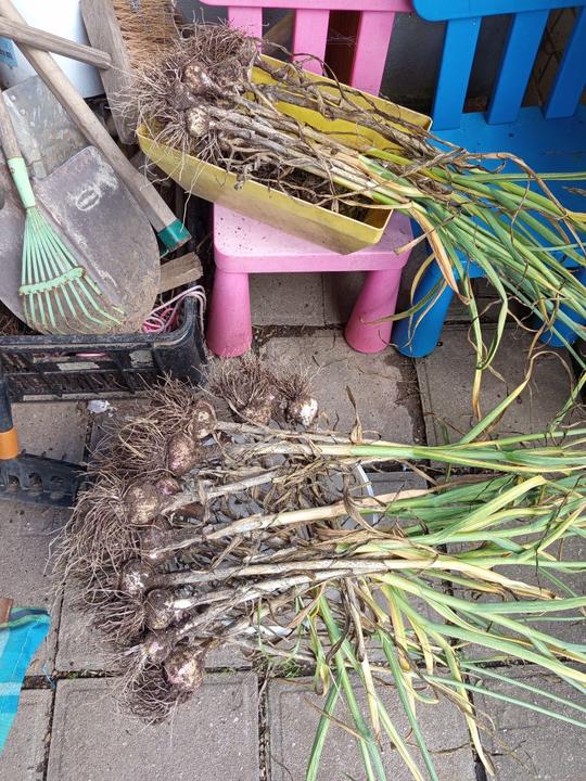 22.7.2025 dnes jsem vytáhla česneky, s úrodou jsem spokojená, dále jsem dostala od souseda 6 kortouců posekané trávy na mulcování- použita do skleníku pod rajčata.