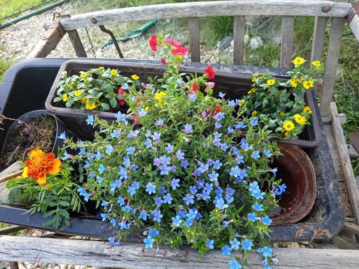 14.6.2025 koupila jsem takovou tu natahovací hadici, konečně zasazeny muškáty. Vládík si zašel 2 kyblíky mrkve. Zbytek sadbových brambor jsem zasazena do kompostu ( dýně už toho asi moc nenaroste a kdyby, soupnu ji ke kamarádkám.