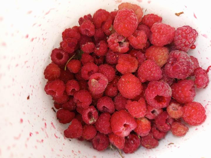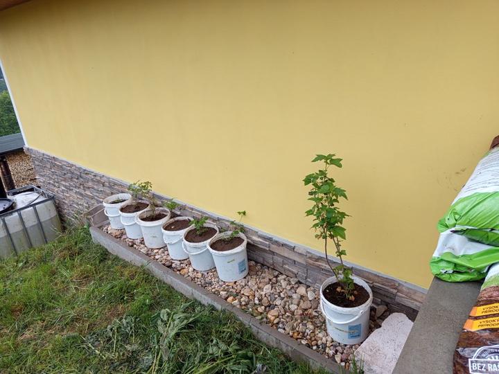 10..7.2025 trham maliny, letos relativně úspěšná sklizeň, sbíráme postupně po ještě h, dnes najednou třetina kyblicku