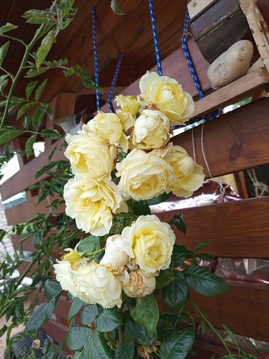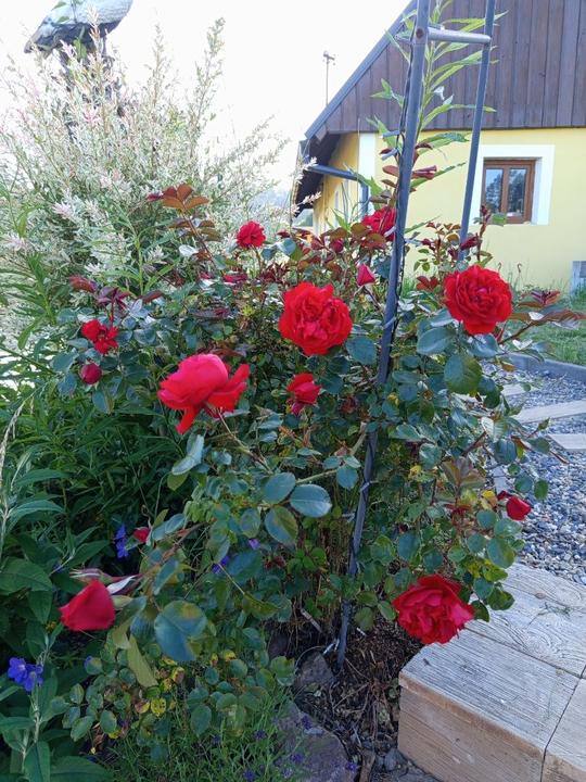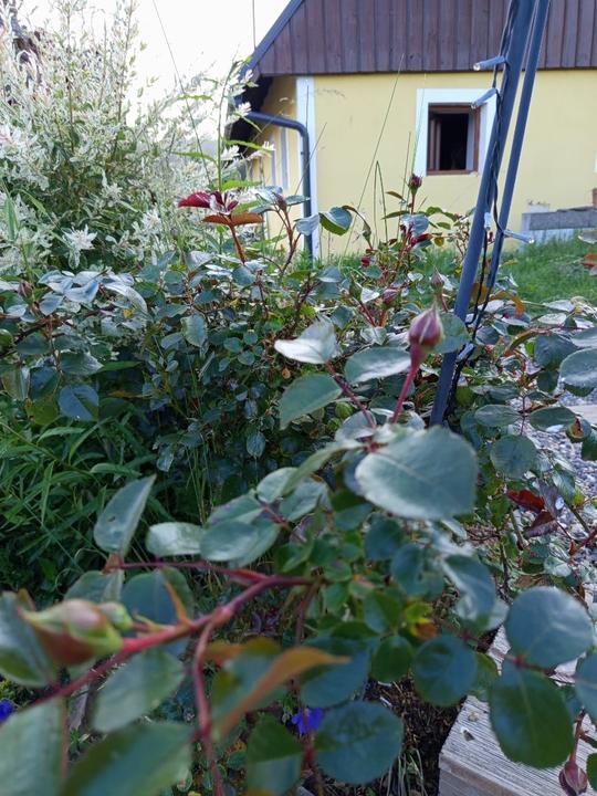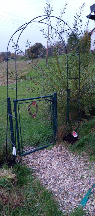 12.10.2025 dnes jsem zasadila k trampolíně 10ks stále plodícího jahodníku Ostara, 6ks jahodníku Korona a 36ks mnou vysazenejch no name jahodníku. Pak jsem složila druhý oblouk a přisadila dvě růže Elfe a Amadeus.