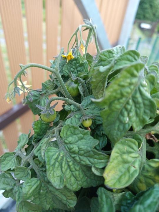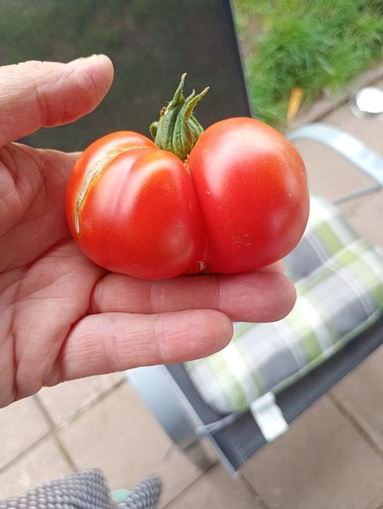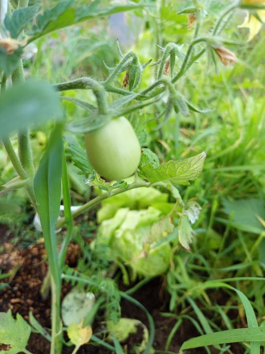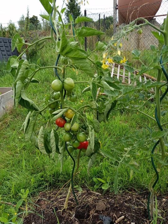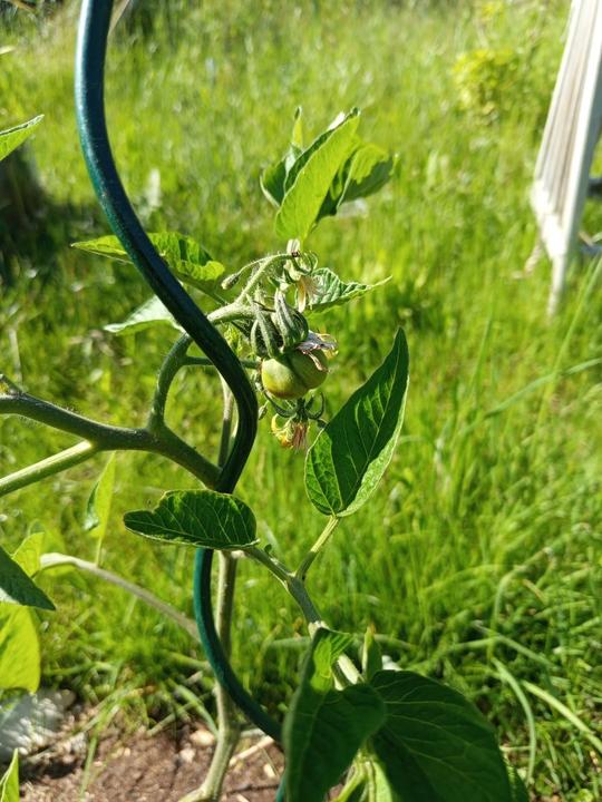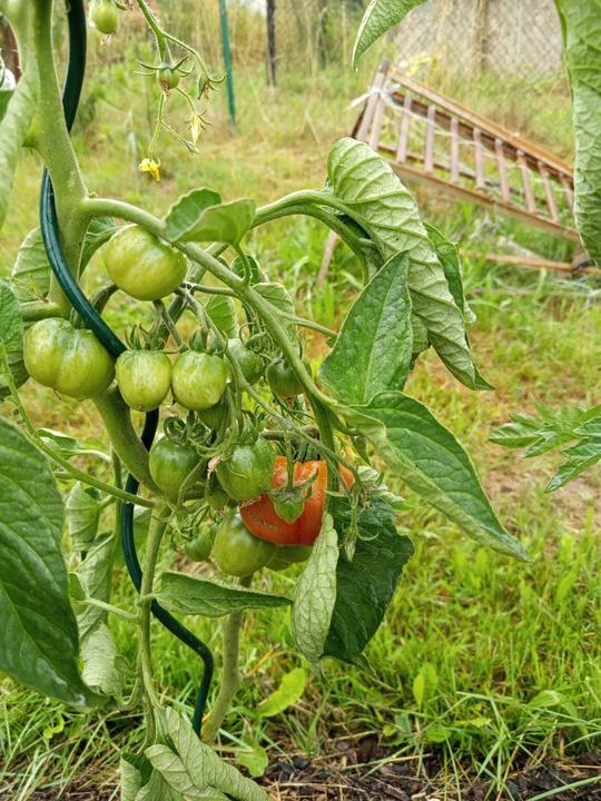 14.7.2025 utržení první rajče, sklizeno z venkovního záhonu před domem, myslím, že bylo od zahradníka a už při koupi kvetlo.
