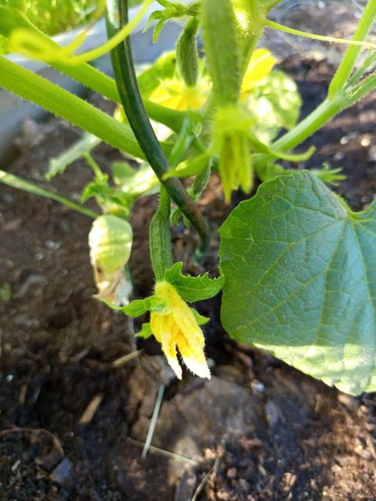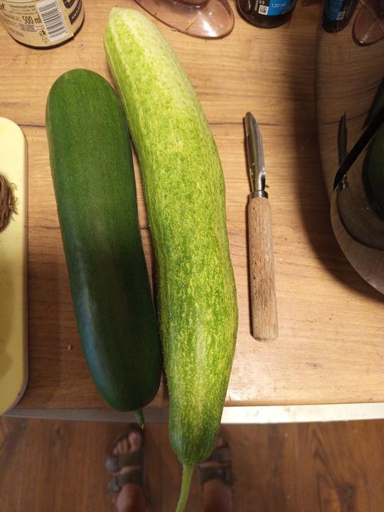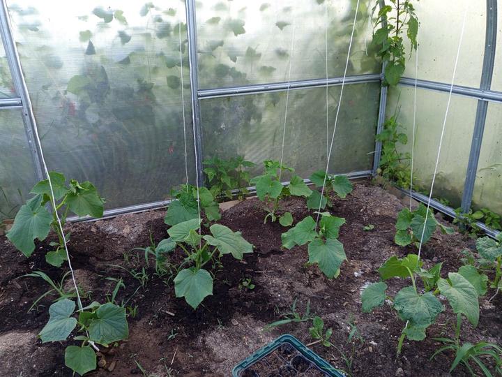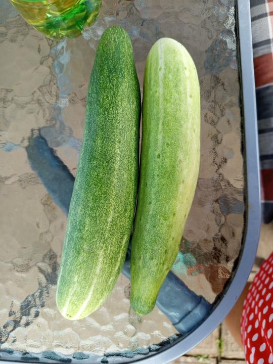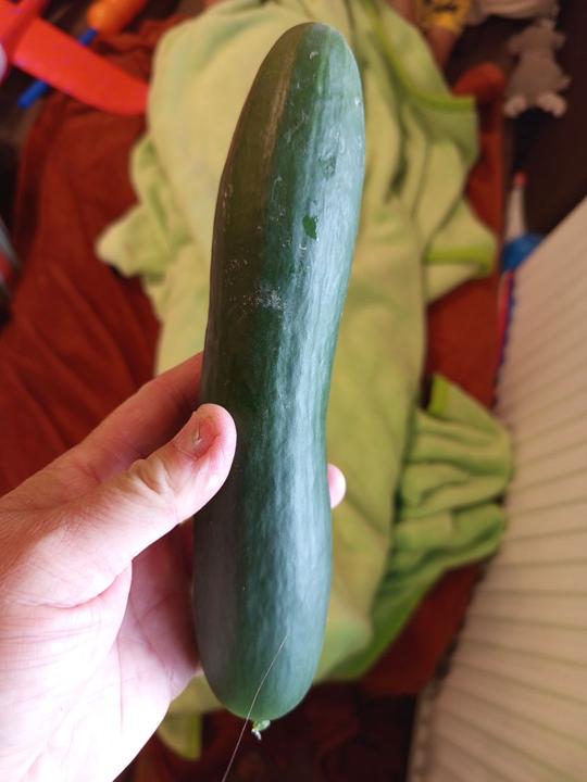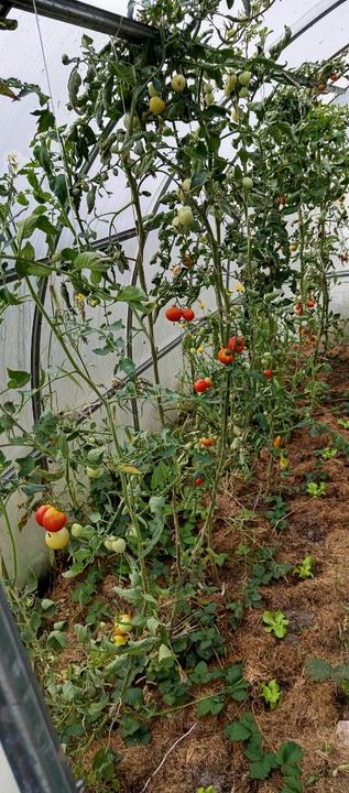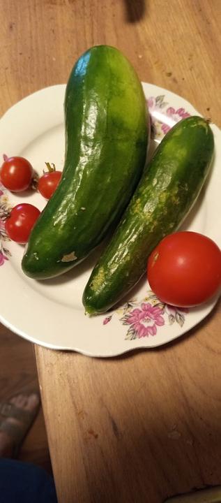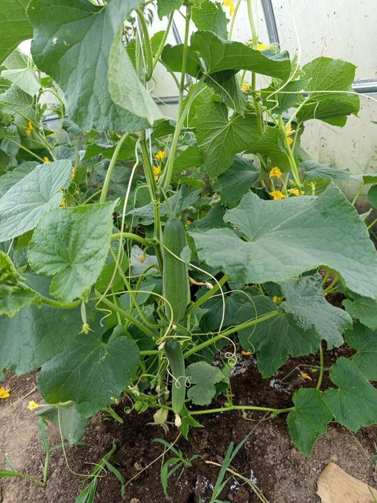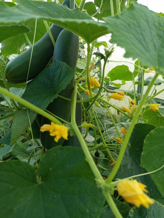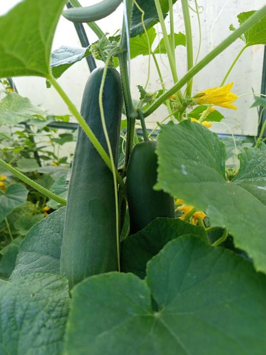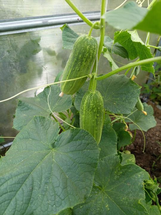 12.7.2025 Dnes je strašné hnusné počasí. Ve skleníku utržený další 2 okurky, č.2 a 3. Červená první 🍅!