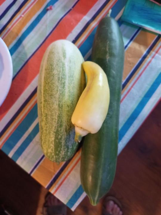 3.9.2025 koupačka, voda 26°C, sklizeny asi poslední skleníkové okurky a první papriky Hamík. Dále jsem objevila 2 krásné jahody z letošní sazeničky od Katky.