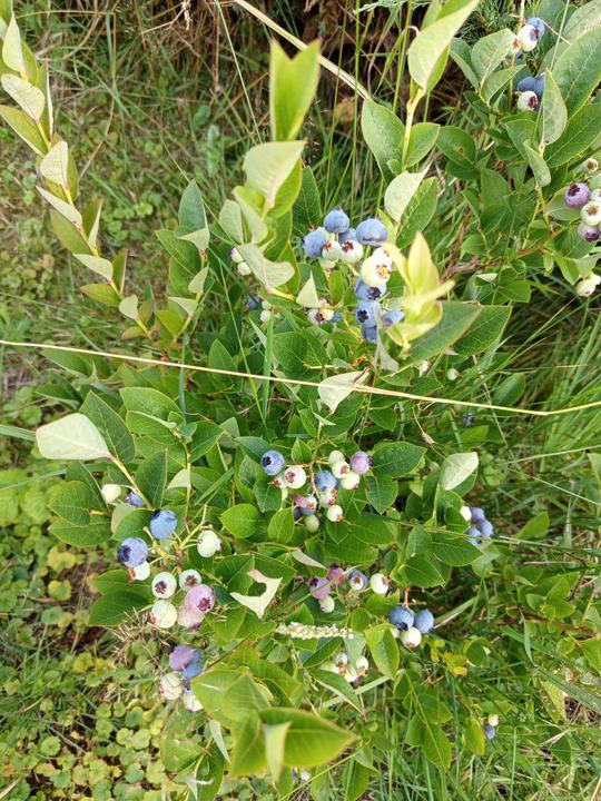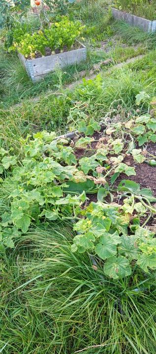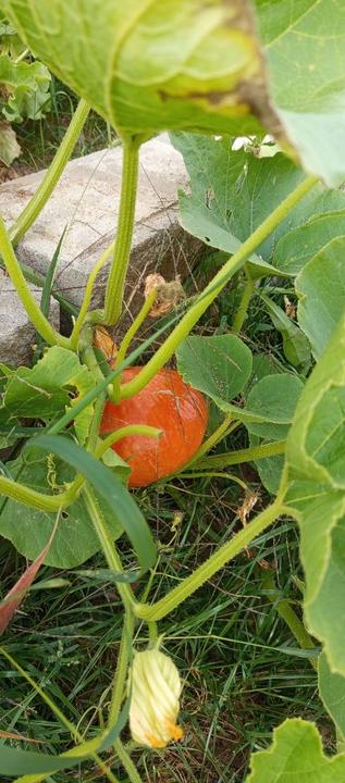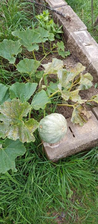 8.9.2025 4 borůvky z horní zahrady přesazený do prostoru po paletách k sušáku. Sklidili jsme první dýni Hokaido, manžel ji nechtíc úseknul.