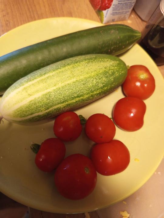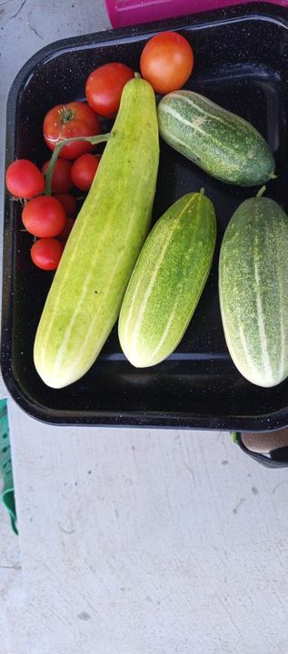 28.7.2025 sklizena první skupinka rajčat a další okurky, priserne se množí slimáci!!!! Jsou jich stovky!😭