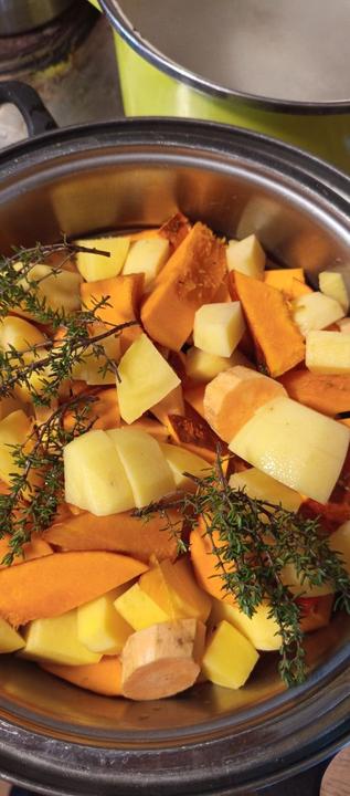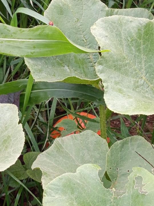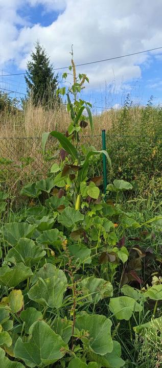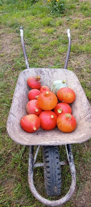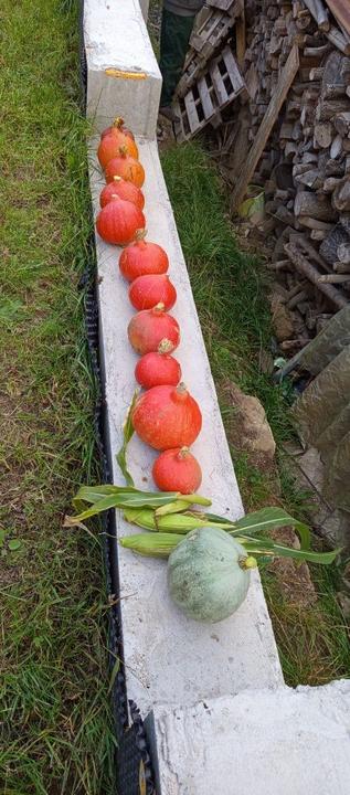 2.10.2025 dnes jsem sklidila 11 ks Hokaido a 1 zelenou dýni. Sklizeny batáty z kyblíků a spolu s dýní i těch pár klásků kukuřice