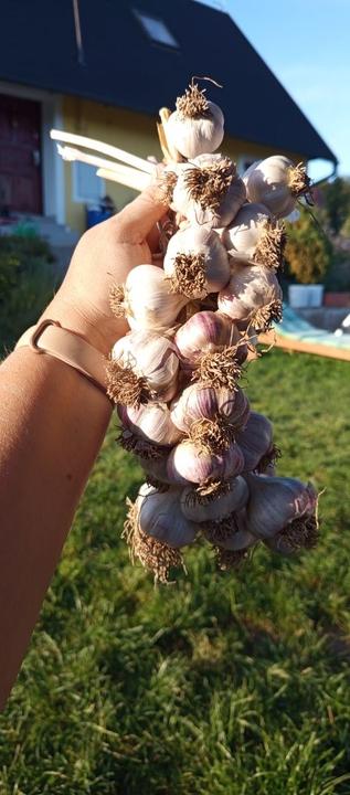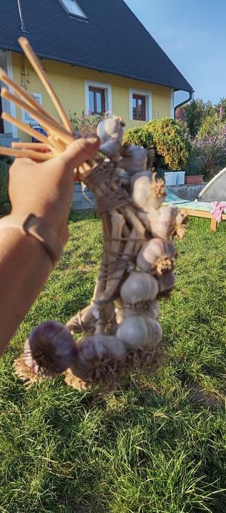 25.8.2025 dnes poprvé zkouším zaplétat cibuli a česnek do copu! Docela makačka, bolí z toho ruce, stejně jak když se plete pomlázka!