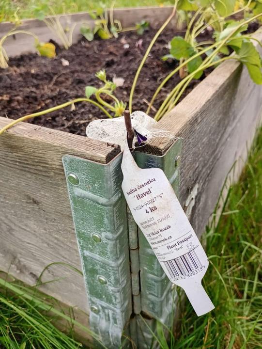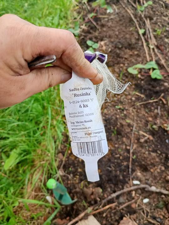 pnoucí Růže 'Uetersener Klosterrose®', nakoupen v síle česnek Havel (Jedná se o odrůdu širokolistého paličáku, která je oblíbená pro svou chuť, dobrou skladovatelnost a velký výnos. Vytváří nafialovělé cibule kulovitého tvaru, ve kterých dozrává 6–8 stroužků s hnědou slupkou. Odrůda je ozimá, polopozdní. Sklizeň je tedy možná asi v polovině léta. Česnek sklízíme v době, kdy dochází k usychání listů) a Rusinka. (širokolistý ozimý česnek. Jedná se o polopozdní odrůdu tzv. ruského paličáku. Velikostně větší cibule mají až nadprůměrně velké a pravidelně uspořádané stroužky. V jedné cibuli je 4–8 stroužků. Celá rostlina je spíše mohutnějšího rázu. Dorůstá do výšky kolem 180 cm. Suknice má lehce narůžovělou barvu. Jedná se o spolehlivou a velmi výnosnou odrůdu, která vyniká i odolností proti půdním chorobám. Tento první ruský paličák je ozdravený od virů a nemá pachuť. Vyniká velmi ostrou chutí.)