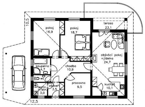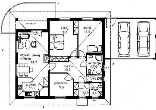 4.2.08 Dnes jsme dostali od projektanta půdorys, rozpis velikostí místností + jaká kde bude podlahová krytina a kde obklady, pohledy ze všech stran, vypadá to fakt skvostně.