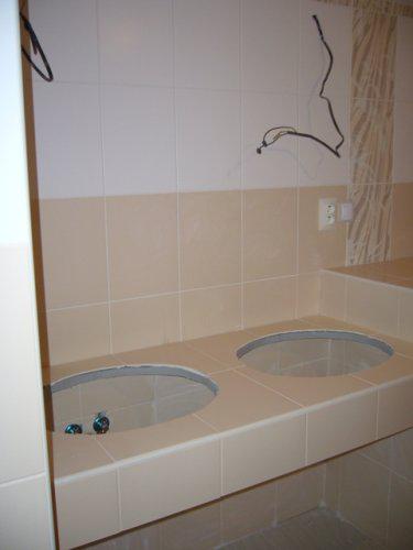 Tak už se to blíží a my asi za 2 měsíce dostaneme klíčky od našeho krásnýho bytečku. Má asi 105m obytné plochy a 2 velké balkony, které mají dohromady asi 50m. Zatím sem vkládám jen fotky koupelny. Obklad je od RAKA Shikoku, strašně se mi líbil.
