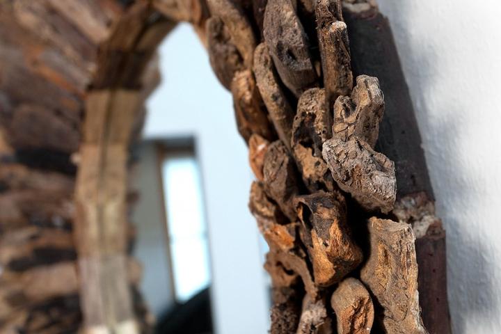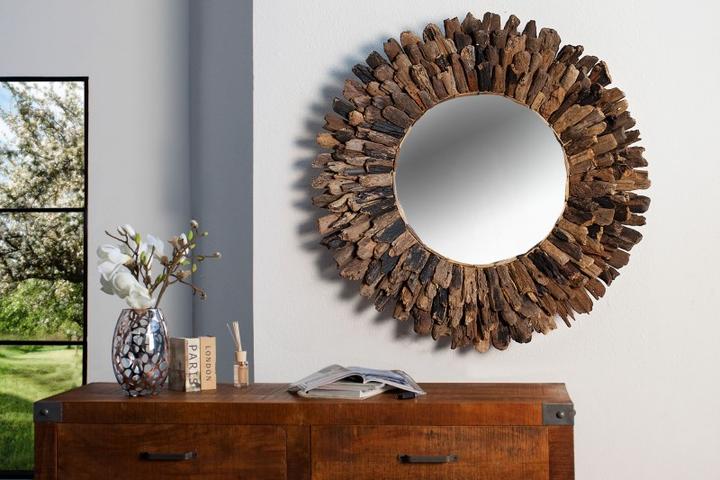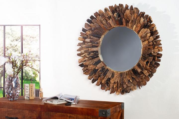 Velké designové zrcadlo na stěnu s dřevěným rámem z teakového dřeva. Toto zrcadlo vás upoutá na první pohled. Dřevěný rám je vyskládaný z dřevěných kousků. Každý kus je proto originál. Průměr je až 100cm. Zkombinujte si ho z masivním nábytkem. Celko…