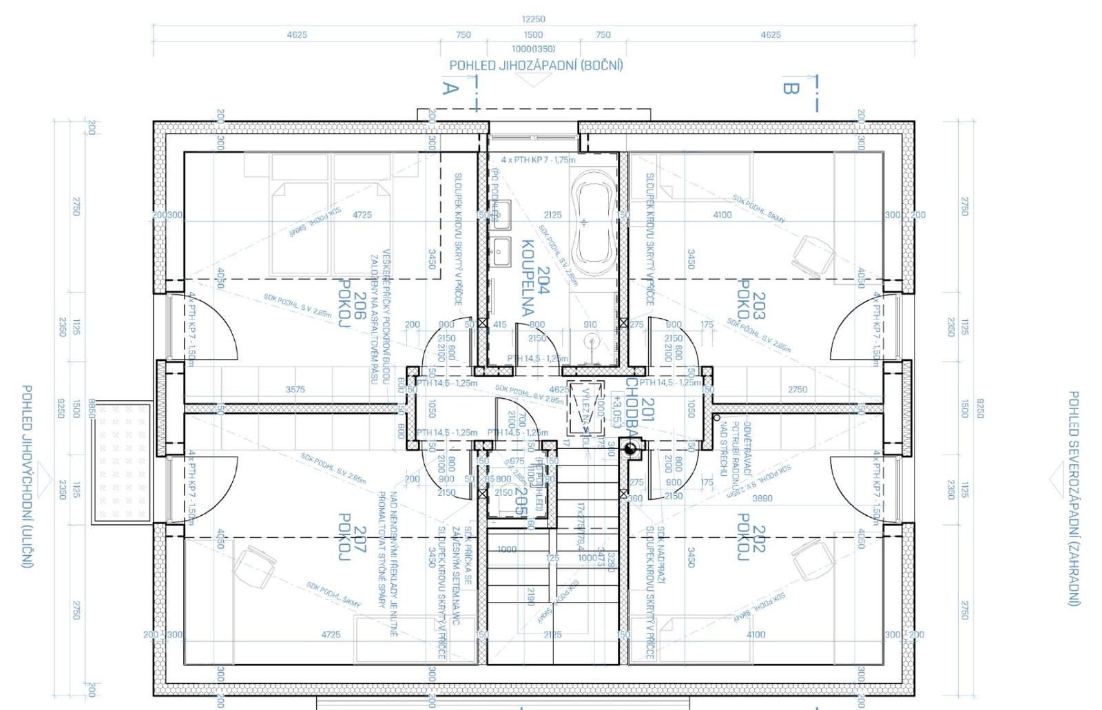 @catle pokojíky pro děti má větší zřejmě z toho důvodu, že se mu díky rozložení místností v prvním podlaží propisuje půdorys do 2.n.p. Bojujeme s tím samým, bohužel. Bungalov mít nemůžeme a dělat nahoře z části terasu asi nemá smysl 😏