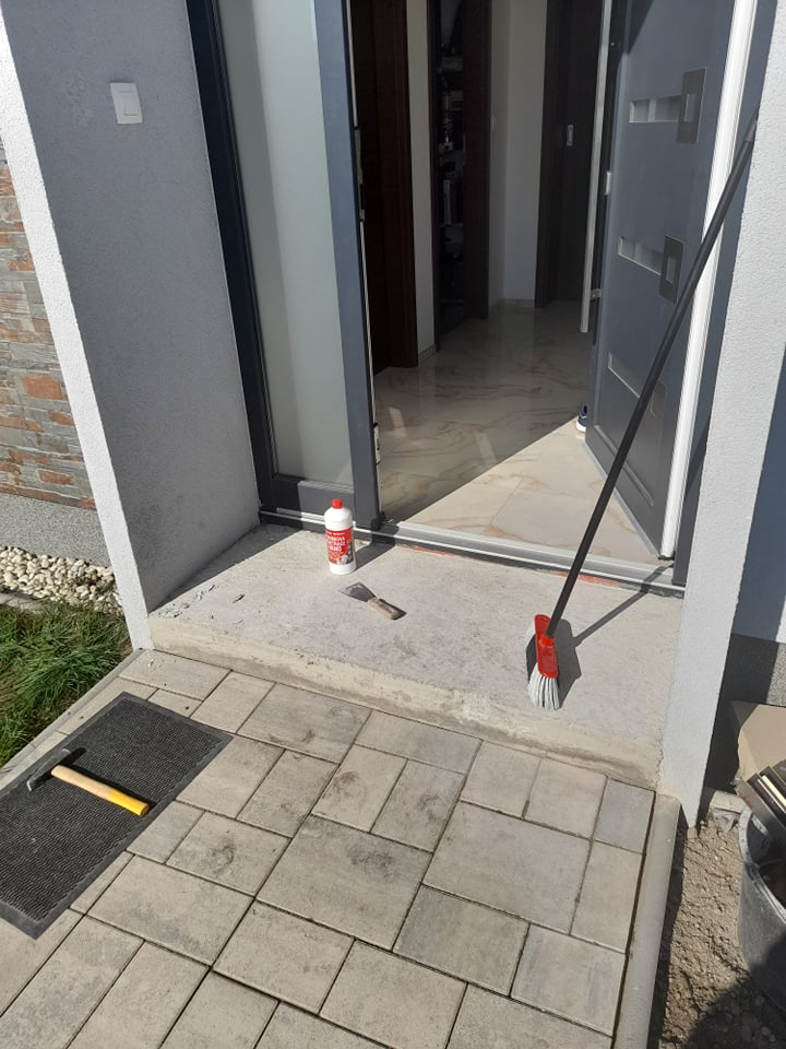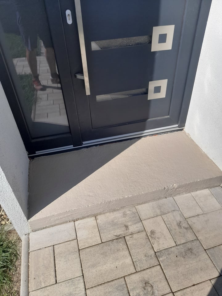 - Povrch jsme před pokládkou očistili od nečistot a prachu. Jde o zdánlivě obyčejný, ale důležitý krok. Vstup do domu jsme důkladně zametli a špachtlí odstranili nerovnosti betonu, aby nám odřezky seděly. Takto připravenou plochu jsme napenetrovali.