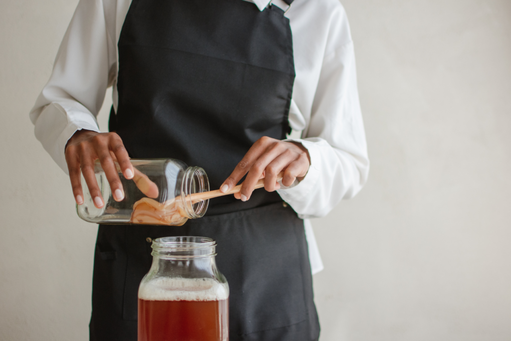Výroba kombuchy je malý rituál, který spojuje tradici s vědou. Začíná přípravou silného čaje (nejčastěji černého, zeleného nebo i bylinkového), který osladíte obyčejným cukrem. Poté do vychladlého čaje vložíte SCOBY, vše přikryjete čistou látkou (aby se dovnitř nedostaly nečistoty, ale zároveň mohl proudit vzduch) a necháte kvasit na tmavém místě při pokojové teplotě po dobu 7 až 14 dní, v závislosti na požadované chuti.