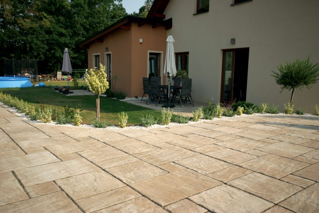 Betonová dlažba imitující pískovec dodává příjemnou atmosféru a přírodní vzhled. Vyznačuje se teplými barvami a nepravidelnými hranami, které dodávají prostoru jedinečný vizuální efekt.