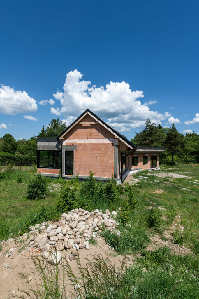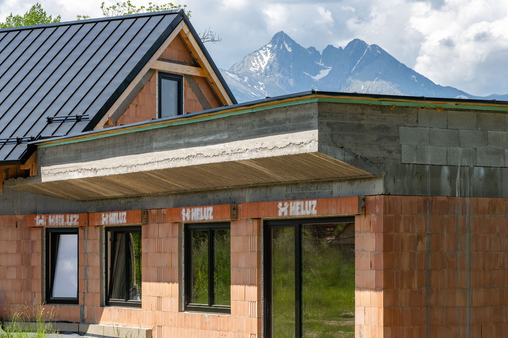 Základová deska je beton, cihly jsme si vybrali HELUZ FAMILY 30 2in1 broušené a máme od nich ještě nadokenní překlady na venkovní žaluzie v krytých schránkách se zabudovanou tepelnou izolací. Okna jsou zvenčí hliníková, zevnitř dřevěná. Krov je ze smrkového dřeva. Ve finále by měl mít dům kamenný a dřevěný obklad bez omítky. Vnitřní podlahy mají být ve společenských místnostech z litého betonu s jemným pastelovým pigmentem, aby to nebylo jen šedé. Ostatní podlahy budou z vinylu a velkoplošná keramika v koupelně.
